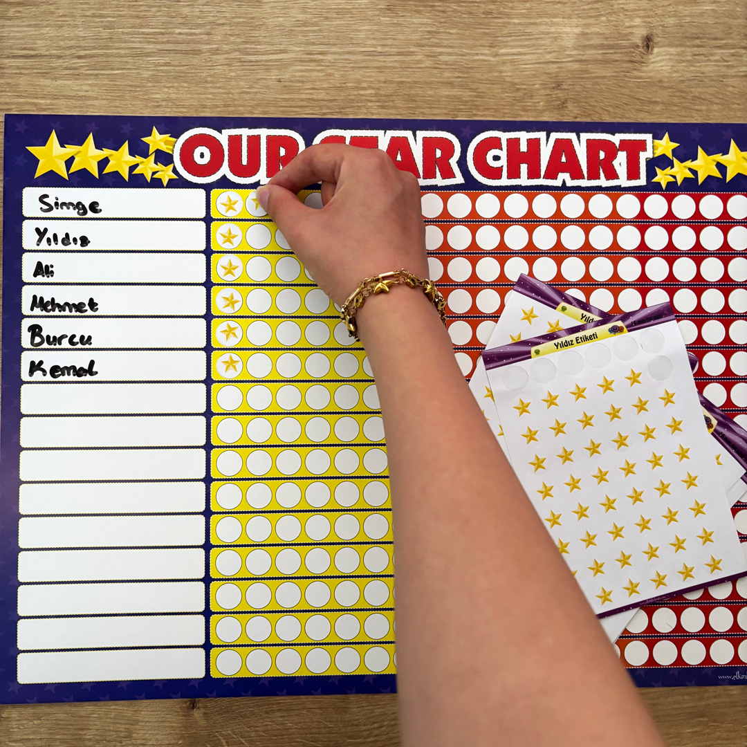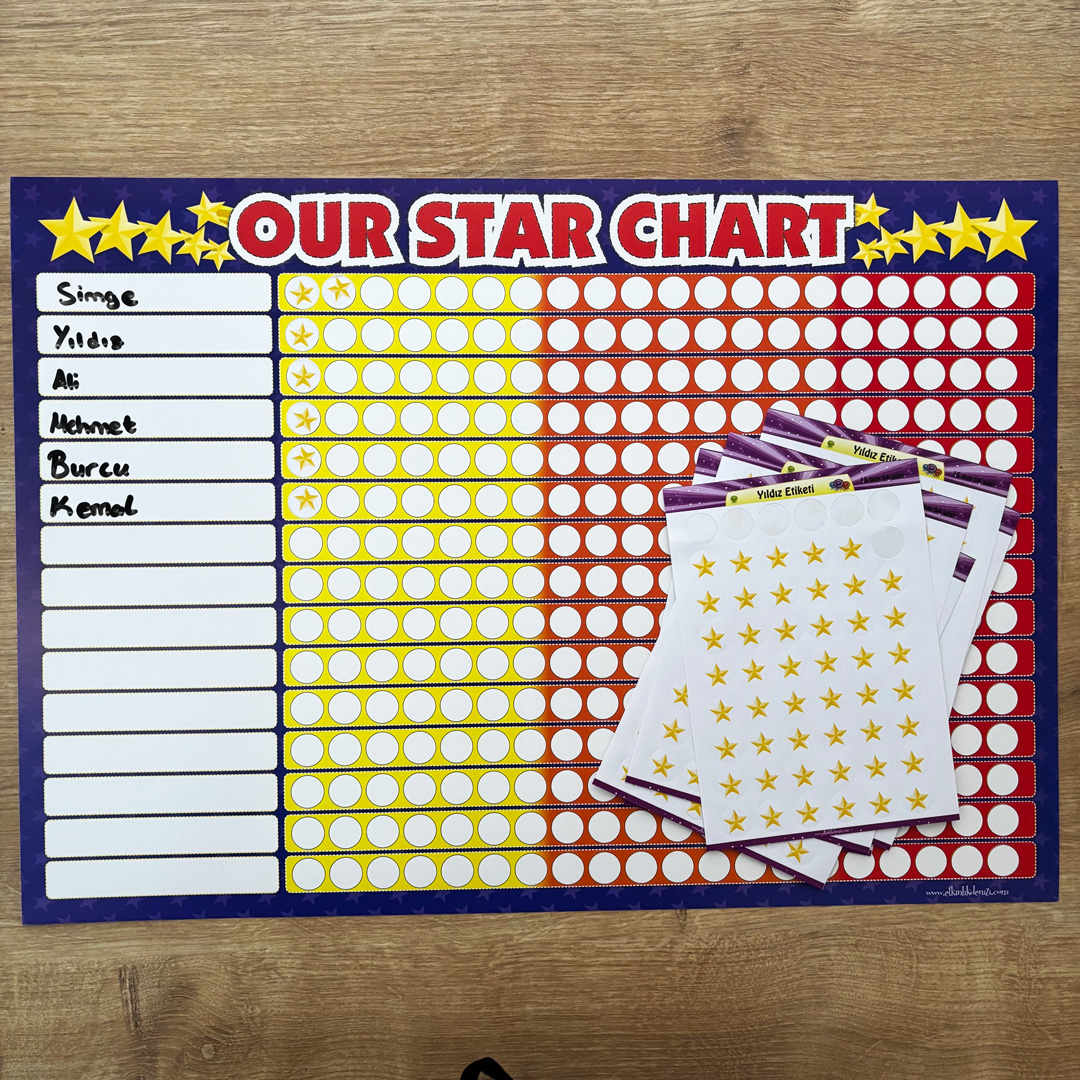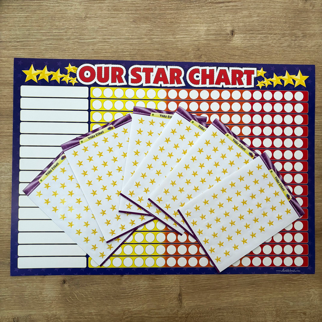 Paket İçeriği: 1 adet Yıldız Tablosu (35cm*50cm Karton) + 6 adet Yıldız Etiketi (54'lü)