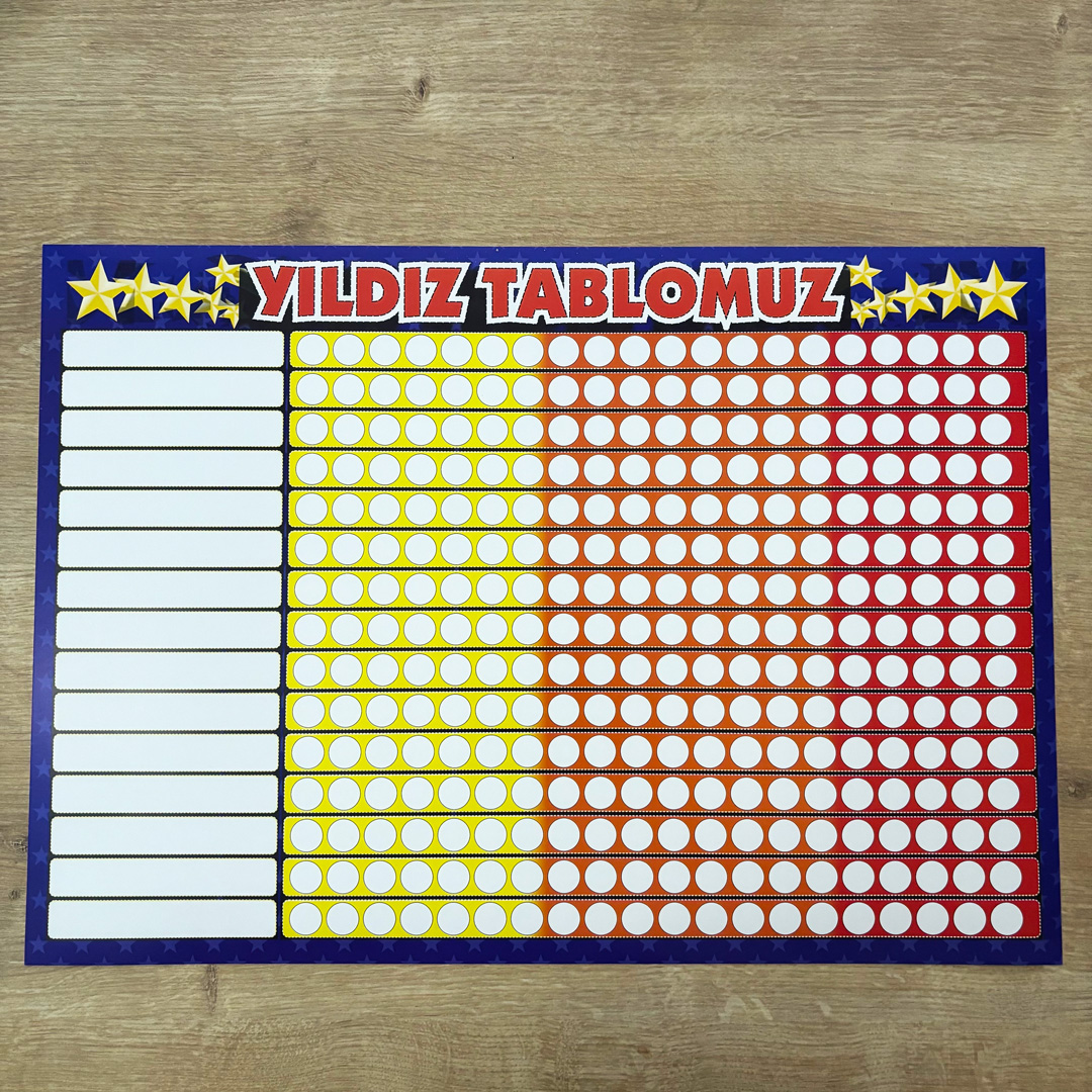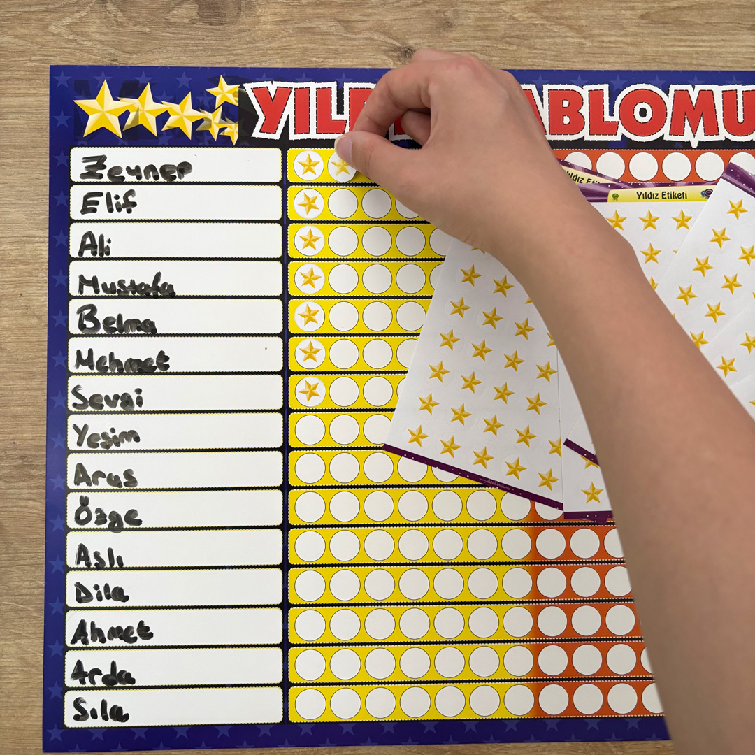 Bu ürün, öğrencilerin başarılarını ve gelişimlerini motive edici şekilde takip etmeyi sağlayan “Yıldız Tablosu” ??